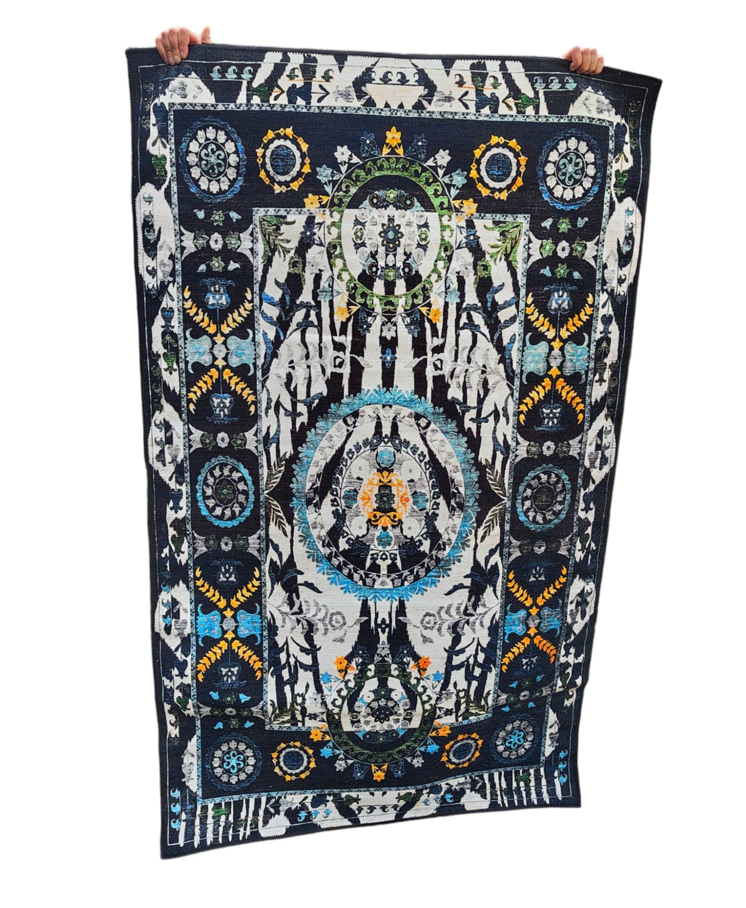 Zanurz się w bogactwie Orientu z naszym wyjątkowym perskim dywanem. Ten ręcznie wykonany kawałek prezentuje urzekającą mieszankę głębokich błękitów, ziemistej zieleni i delikatnych neutralnych kolorów, tworząc bogatą i zapraszającą atmosferę. Intrygujący kwiatowy motyw i centralny medalion zostały starannie utkane, aby zaprezentować kunszt i tradycję perskiego tkactwa. Wykonany z mieszanki wysokiej jakości polipropylenu i bawełny, ten dywan oferuje zarówno trwałość, jak i styl. Idealny, aby dodać odrobinę luksusu do Twojego salonu, jadalni lub sypialni.